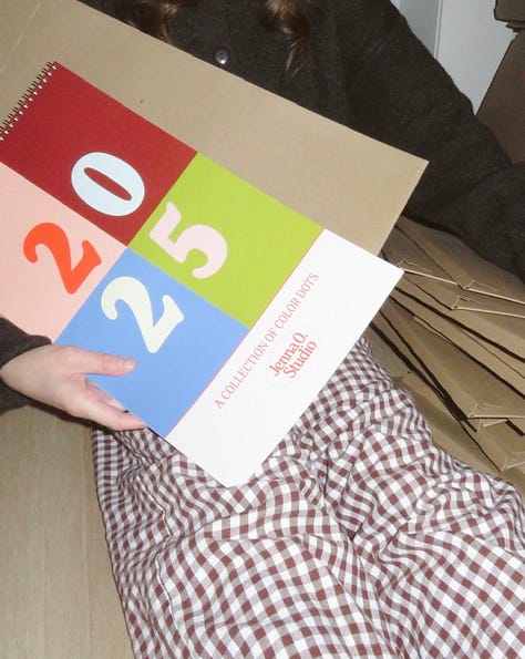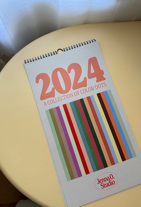Every year, I sell a color dot calendar. The 6th edition is now available for preorder! The process is very grassroots. I host preorders for a month and a half, and that is the exact amount of calendars I order from the printer, then I ship them all from my apartment! The quantity is minimal, and the timeframe to order is short because that’s all I can manage with a one-woman operation! But I would love to send you one and make you a part of the coveted Calendar Club. You can place your order here.