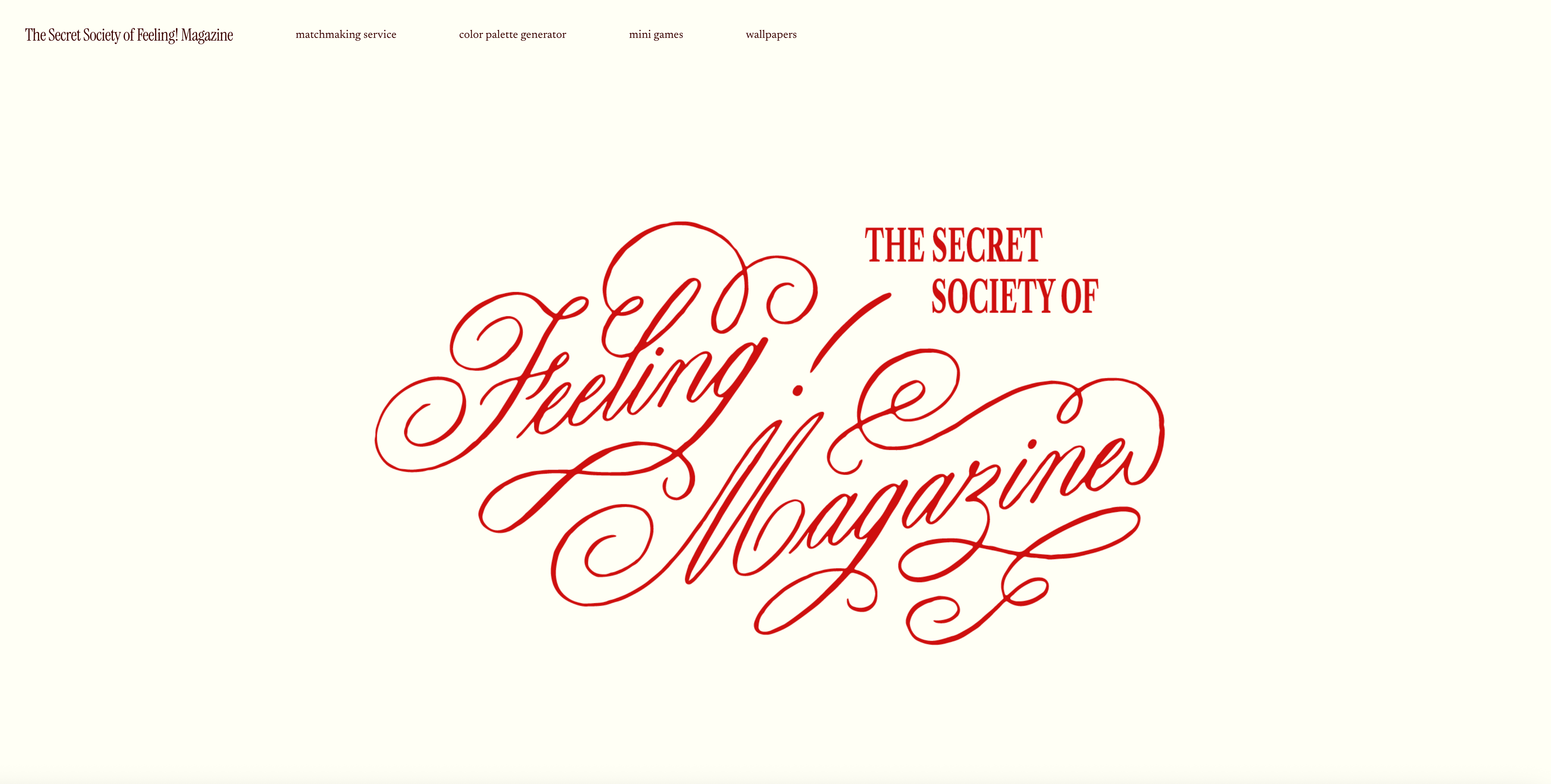 Welcome to the Secret Society of Feeling! Magazine, a members-only website exclusively for paid subscribers of Feeling! It will host a variety of exciting, wonderful activities just for you. Built on Squarespace, the website will house custom mini games, our complete collection of all our downloadable desktop and phone wallpapers, and even a color palette generator for your next creative project.