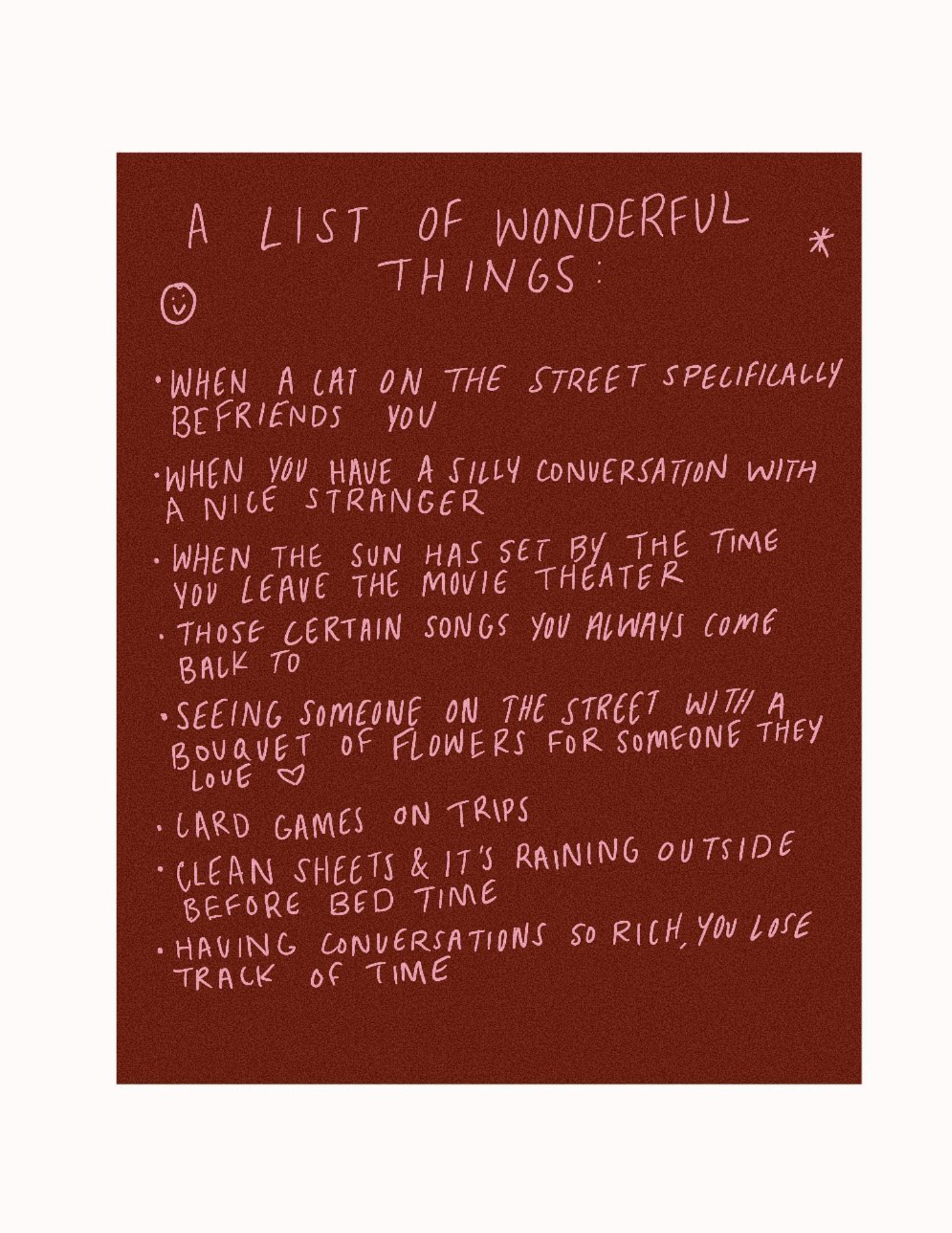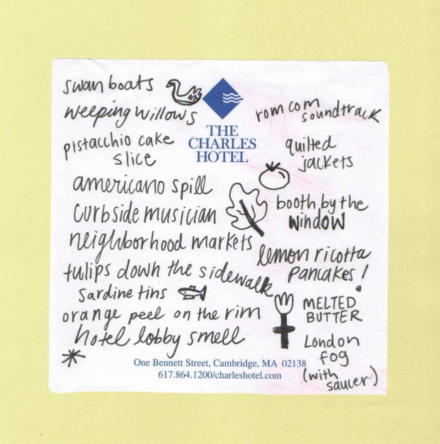 Your lists and logs can be stored in a trusty notebook, your notes app, or on scraps of paper. It’s just for you, so you can be as messy as you’d like. They are also ongoing — you can start lists and add to them forever. Here are some list prompts to build out your collection: