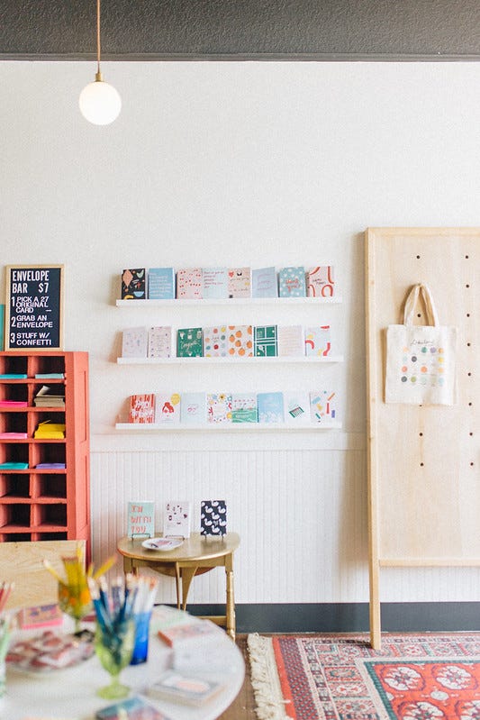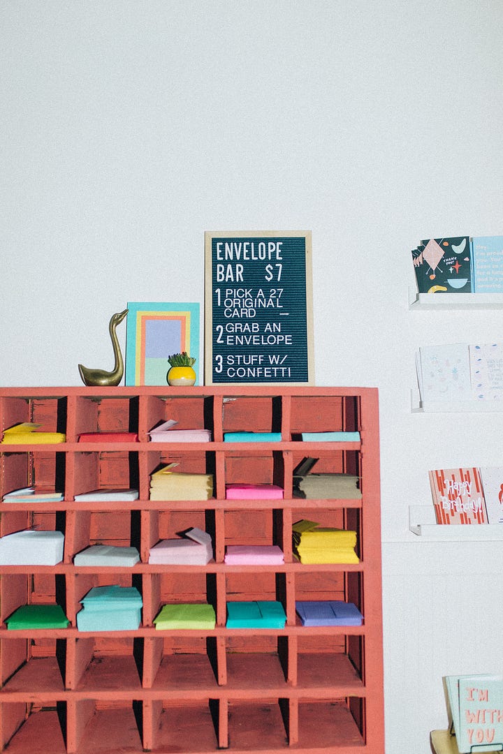 The crowning glory of my storefront was the greeting card bar, where you could pick any of my cards, any colored envelope, and then a scoop of your choice of confetti. I’d sit at the register and watch guests meticulously choose their card, envelope, and confetti, and wonder how far the card would go. Who was it for? What would they write in it? Sympathy cards came to the register, congratulations cards stuffed with confetti, birthday cards, and romantic cards. It felt like such an honor to keep shop while all these moments were marked for others — an honor to play a small part.